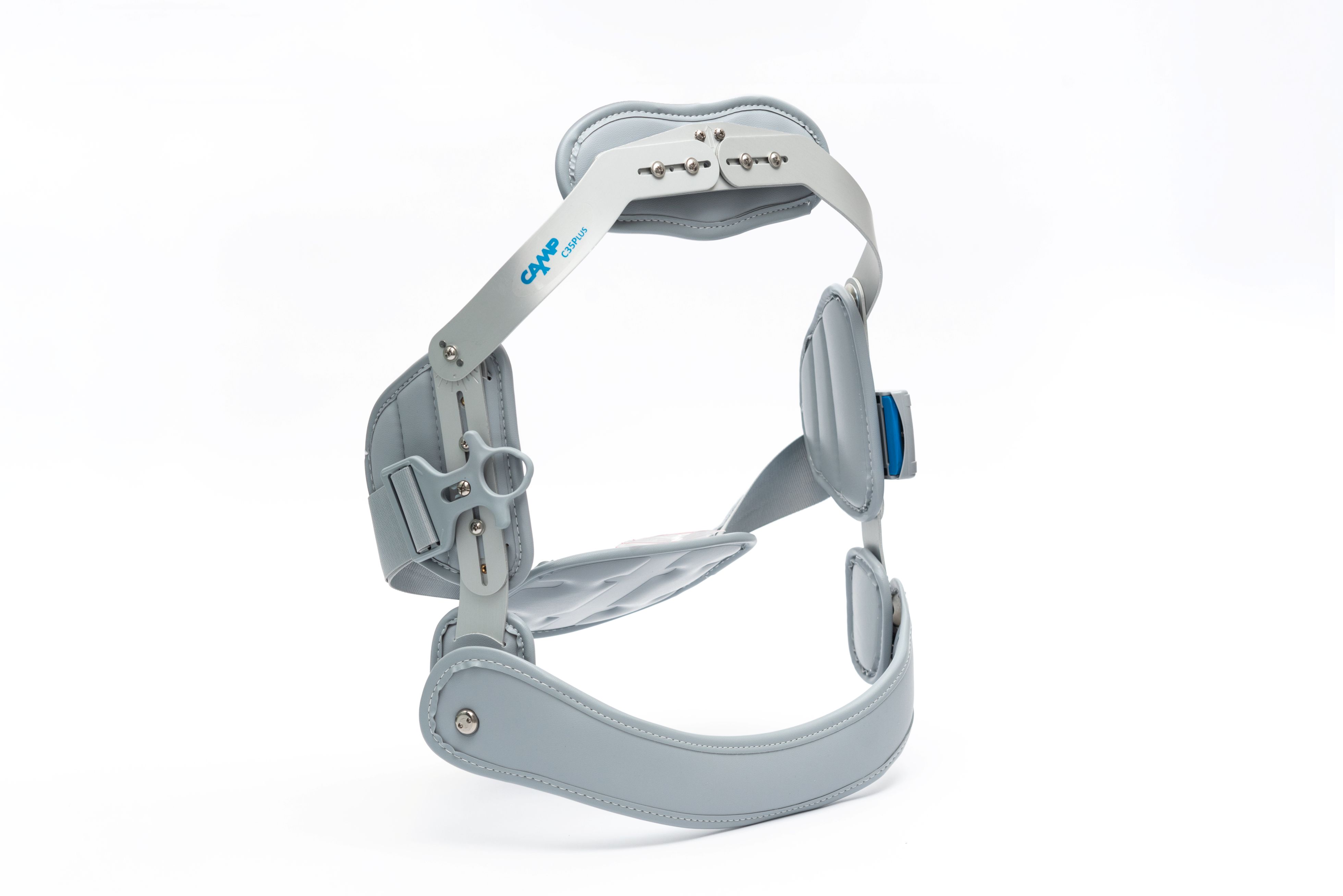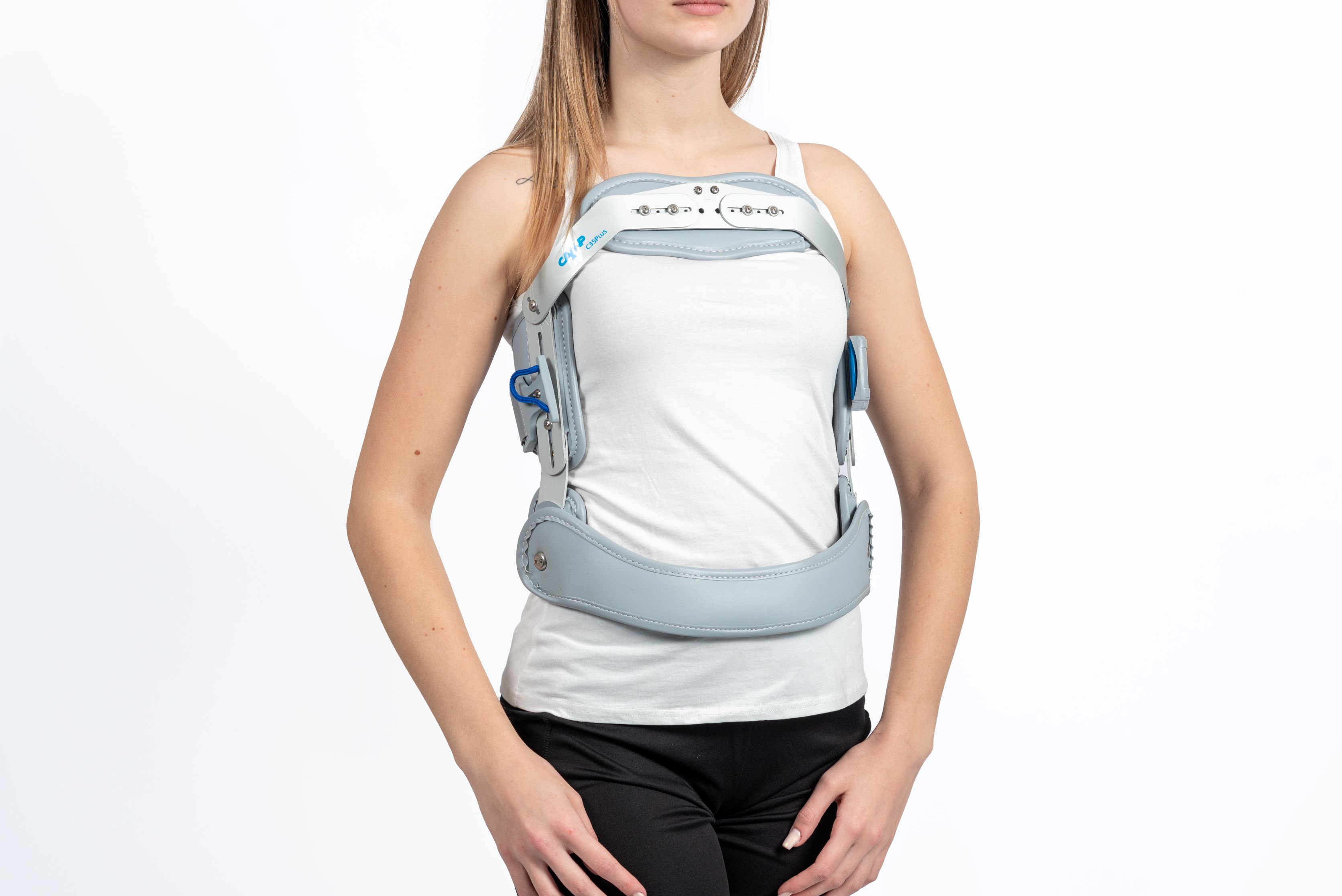 Le articolazioni ascellari sono regolabili, consentendo un set-up personalizzato in base alla conformazione del torace e delle spalle. La chiusura a clip è dotata di bloccaggio di sicurezza, per mantenere l’assetto impostato durante l’uso. Il cinturone è regolabile in lunghezza, così da completare l’adattamento del corsetto in modo semplice e ripetibile.